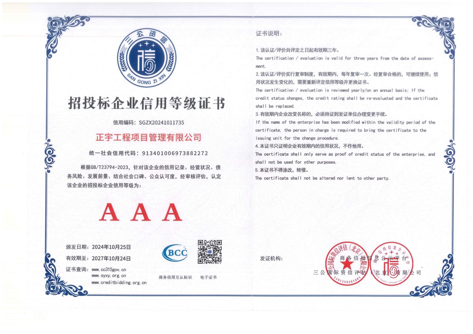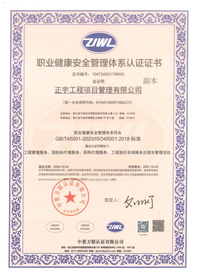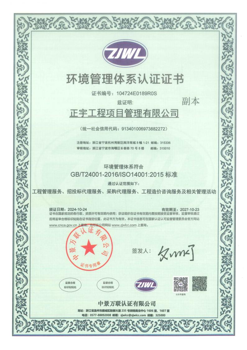 正宇工程項目管理有限公司成立于2009年,注冊資金6080萬,注冊地為浙江省寧波市杭州灣新區(qū)。公司擁有國家住建部頒發(fā)的工程造價企業(yè)甲級資質(zhì)、招標代理資質(zhì)等等;是一家專業(yè)從事工程項目管理、企業(yè)管理、政府采購代理服務、招投標代理服務、信息技術咨詢服務及其他技術服務的綜合型工程咨詢公司。
